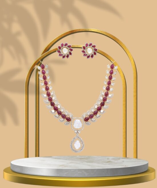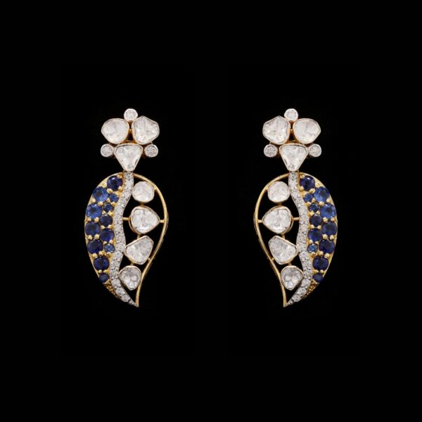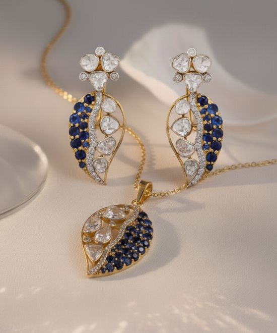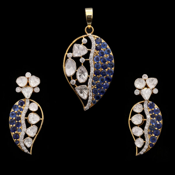 Shine with the 14kt Blue Sapphire Pendant Set with Polki Diamond from Laxmi Hans Impex. Designed with our open-setting technique in pure gold, this exquisite set blends blue sapphire, Polki, and diamonds for unmatched elegance, authenticity, and refined sophistication.