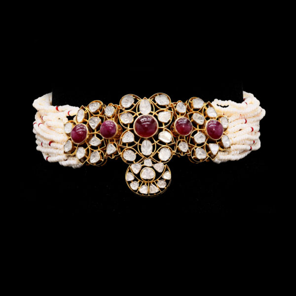 Experience regal charm with the 14kt Ruby Choker Set with Polki by Laxmi Hans Impex. Handcrafted in pure gold, featuring radiant rubies and sparkling Polki, this elegant choker set showcases authentic craftsmanship, light luxury, and timeless sophistication for every special occasion.