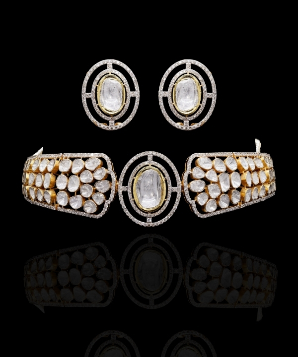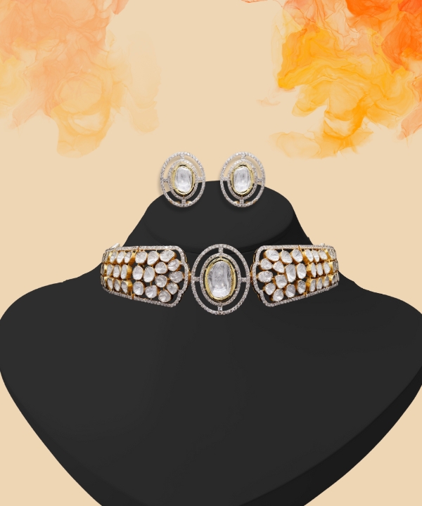 Celebrate in style with this 14k gold Polki necklace, featuring diamond polkis and colorful gemstones arranged in a radiant open setting. Bold yet wearable, it brings sparkle and tradition together—ideal for Diwali, weddings, or gifting someone special a timeless treasure.
